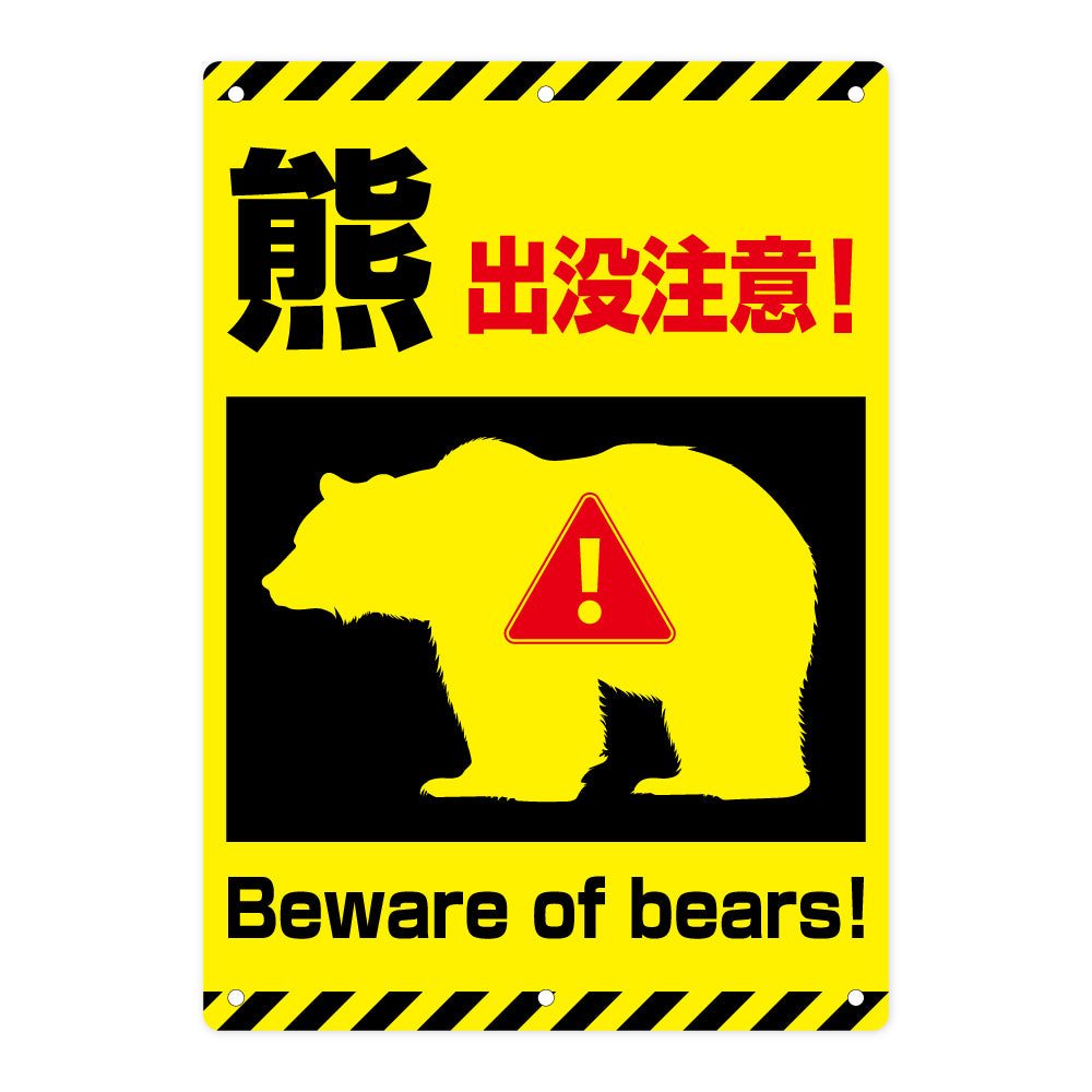 【熊出没注意 看板】A3/A4サイズ・1枚/5枚セット選択可|屋外用 防水サインプレート|6穴加工で結束バンド取付OK|フェンス・金網・柱対応|注意喚起・クマ対策 イエロー